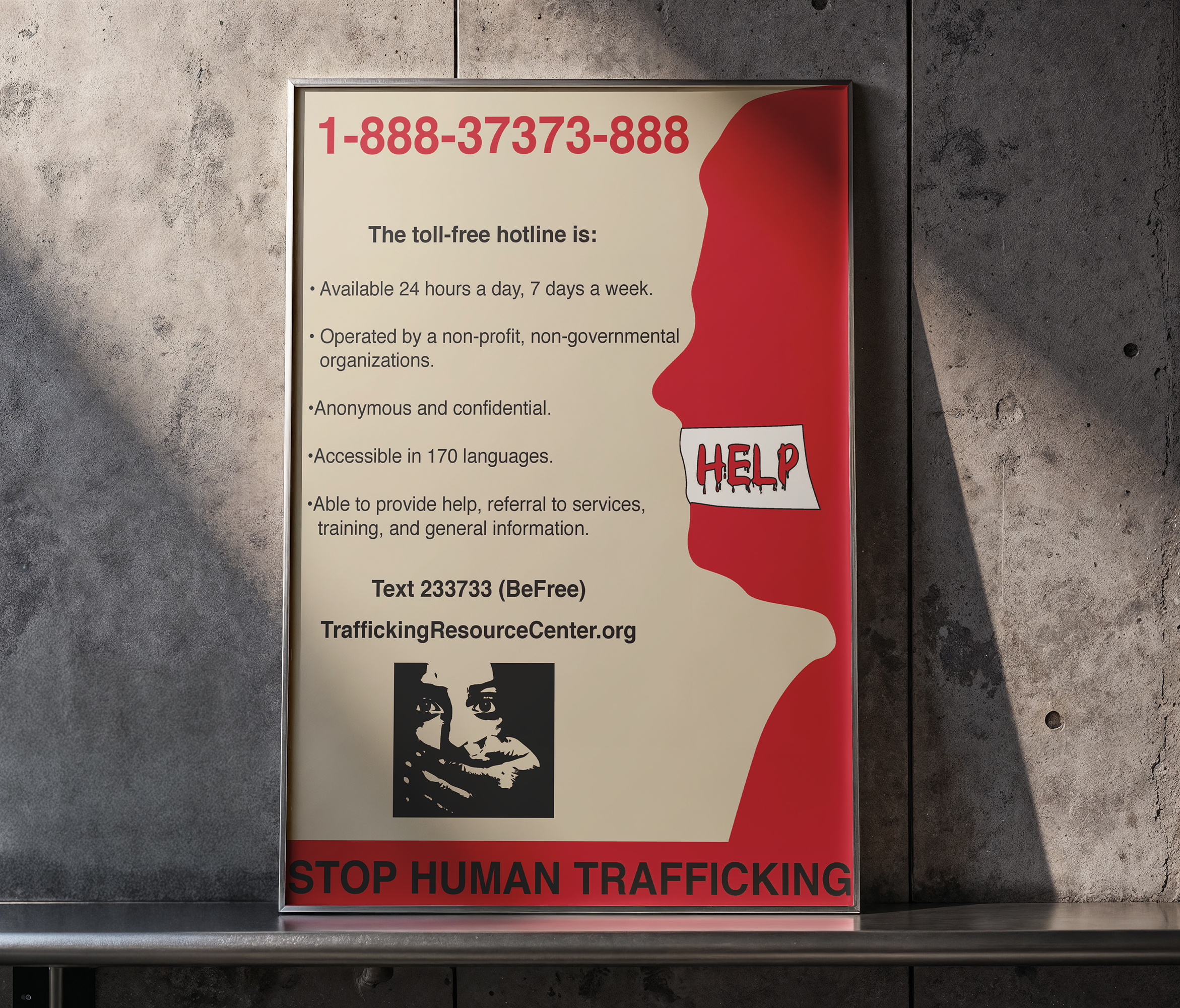 I created a short video combining visual storytelling with impactful messaging to evoke empathy and understanding, supported by a series of posters and animated GIFs that highlight the emotional and psychological toll of trafficking. Each piece incorporated bold visuals, compelling design elements, and critical resources such as emergency hotline information to encourage action and connect audiences to immediate support.
